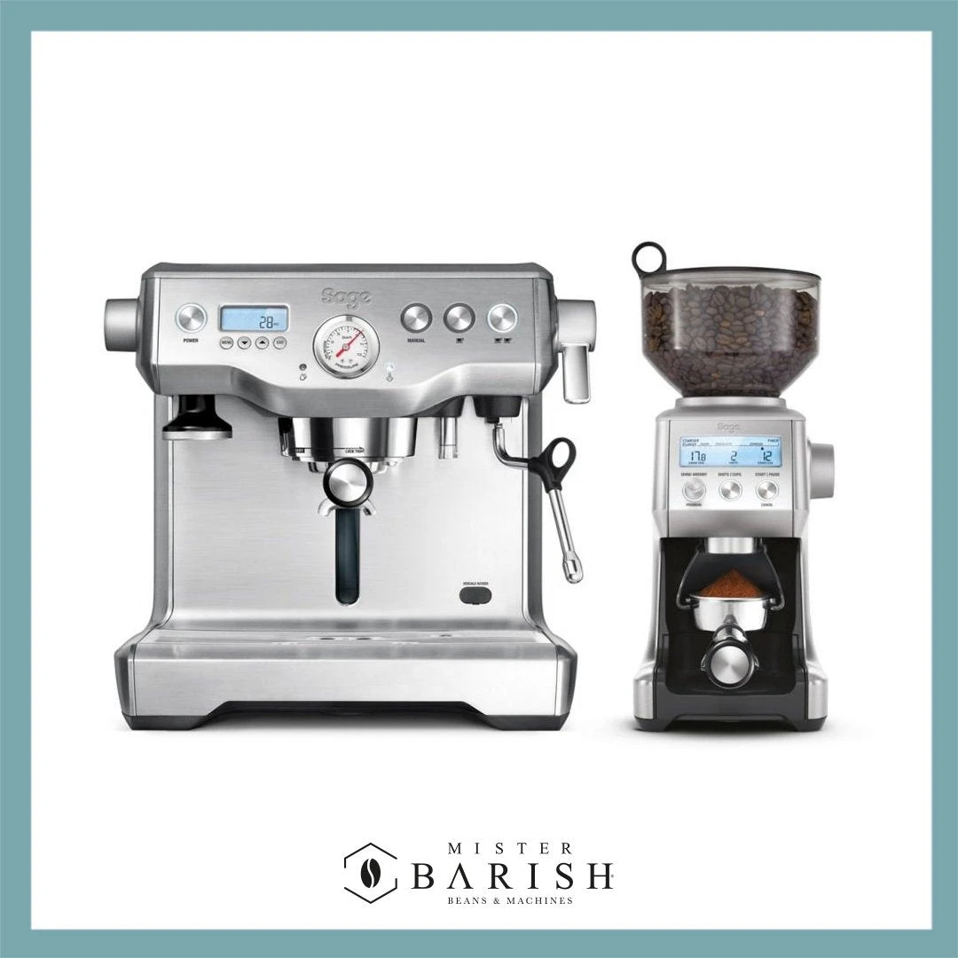 Het Sage Dynamic Duo bestaat uit de Dual Boiler en de Smart Grinder Pro. De Dual Boiler is een espresso machine dat geen bonenreservoir heeft en dus enkel koffie kan zetten met gemalen koffie. Heb je graag de beste koffie thuis? Dan is het Dynamic Duo de ideale combinatie. De Smart Grinder Pro is namelijk een elektrische koffiemolen die zeer precies je koffiebonen kan malen.