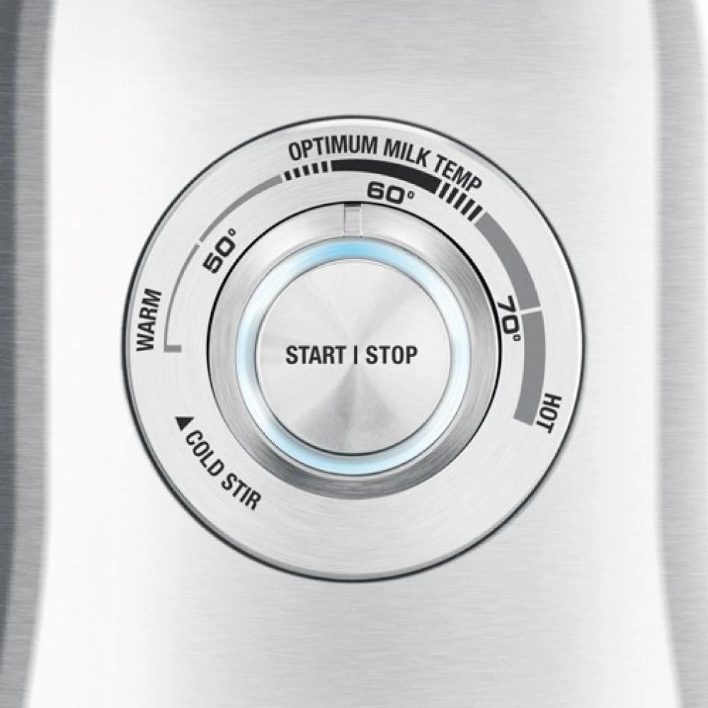 De Milk Café is zeer intuïtief te bedienen. Eerst kies je een minigarde, eentje voor cappuccino of eentje voor latte. Door middel van de handige draaiknop vooraan op het apparaat kan je kiezen voor koude melk of tussen warm of hete melk. De optimale melktemperatuur staat ook aangegeven op de melkopschuimer, zodat je op een snelle manier tot perfect melkschuim kan komen. Eens gekozen, druk je gewoon op start. Wanneer de Milk Café de gewenste temperatuur heeft bereikt gaat het toestel vanzelf in slaapstand