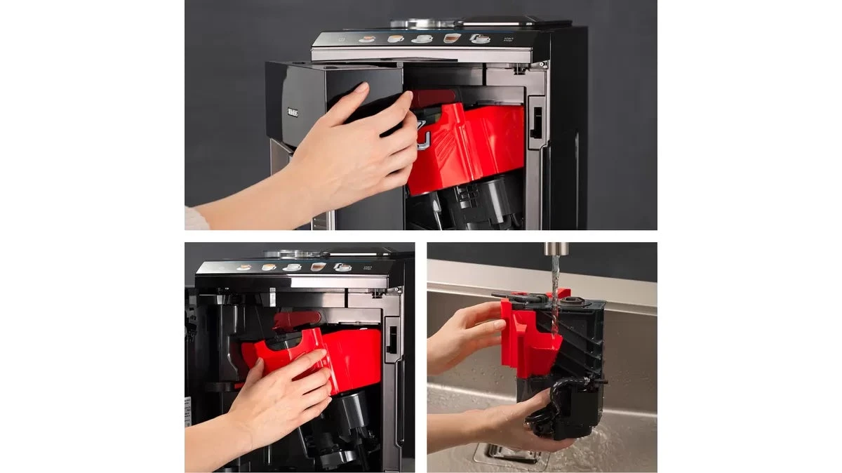 Het iAroma systeem zorgt telkens voor een heerlijk consistent kopje koffie en dit met een minimum aan onderhoud. Uit elke koffieboon wordt het beste aroma gehaald en dit gebeurt door middel van 4 technologieën. Het slijtvaste keramische maalwerk zorgt voor de nauwkeurigste maling van de koffiebonen. Het hoogtechnologische pompdruksysteem zorgt op zijn beurt voor een optimale extractie van de aroma’s en ondertussen houdt het sensoFlow verwarmingselement een constante bereidingstemperatuur aan. Het feit dat je de zetgroep uit het toestel kan nemen zorgt er dan weer voor dat je het gemakkelijk kan reinigen zodat alles optimaal kan blijven werken en je de heerlijk smaak blijft behouden.